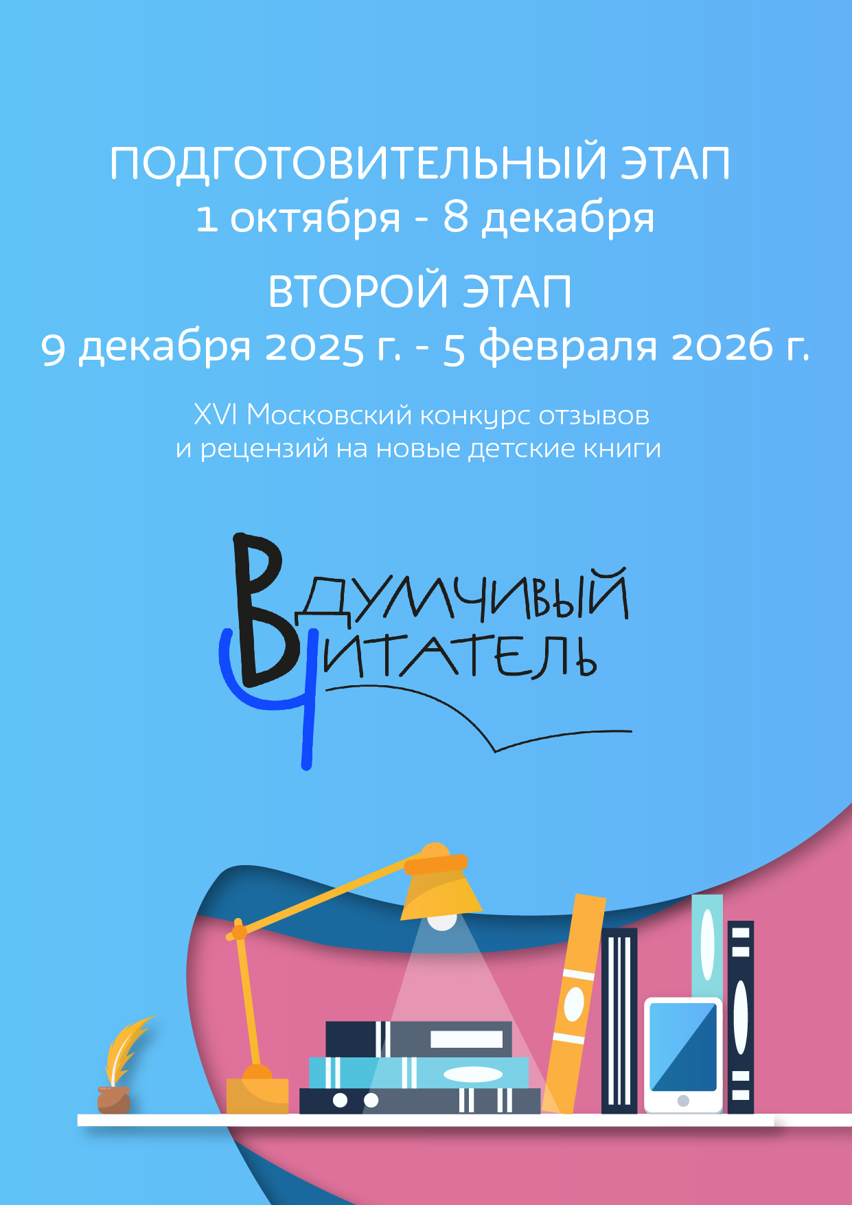 Приглашаем вдумчивых читателей ЮЗАО принять участие в XVI Московском конкурсе отзывов и рецензий на новые детские книги "Вдумчивый читатель"! Участники конкурса отбирают книги для отзывов по двум выпускам ежегодного рекомендательного каталога "100 лучших новых книг для детей и подростков» за 2024 и 2025 гг. (электронные версии каталогов). Участники заполняют форму регистрации на специальной странице на официальном сайте Организатора и отсылают готовую творческую работу на электронный адрес конкурса: konkurs@gaidarovka-metod.ru. К участию в конкурсе приглашаются читатели библиотек в номинациях: - младшая школьная номинация (4-6 классы); - средняя школьная номинация (7-8 классы); - старшая школьная номинация (9-10 классы); - взрослые читатели детской литературы (учащиеся 11 классов, студенты профильных ВУЗов и СУЗов, библиотекари, учителя, родители). Конкурс проводится в 2 этапа: подготовительный и основной. Подготовительный этап: с 1 октября по 8 декабря 2025 года. Библиотеки оказывают информационную и консультационную поддержку участникам конкурса. Второй этап проходит с 9 декабря 2025 года по 5 февраля 2026 года. На этом этапе конкурсные работы рассматриваются жюри конкурса. Приём конкурсных работ и регистрационных форм осуществляется до 8 декабря 2025 г. включительно. Список финалистов и информация о проведении финальной Церемонии награждения победителей и финалистов Конкурса публикуются на специальной странице сайта. В Моем досуговом центре "Атлант" площадками выступают 5 библиотек: - ОСП "Библиотека № 172", ул. Новаторов, д. 14, к. 2 -ОСП "Центральная библиотека № 190", ул. Миклухо-Маклая, д. 40, корп. 1 -ОСП "Библиотека № 196", Симферопольский б-р, д. 24, корп. 1 -ОСП "Библиотека № 179", ул. Вавилова, д. 86 -ОСП "Библиотека № 174", ул. Академика Пилюгина, д. 3, к. 3