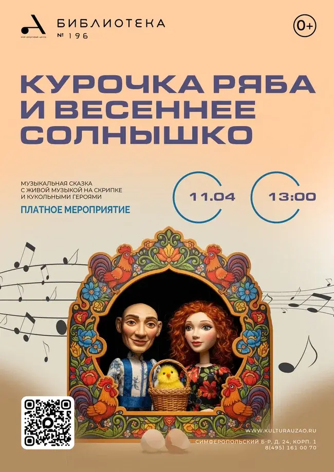 Библиотека № 196 приглашает на детский кукольный спектакль " Курочка Ряба и весеннее солнышко" Зрители погрузятся в удивительный мир сказок вместе с живой музыкой на скрипке и яркими кукольными героями. Эта история не просто развлекает – она учит доброте, храбрости и взаимопомощи, дарит радость и вдохновение как детям, так и взрослым. На сцене оживают трогательные приключения, которые захватят внимание и подарят уютную атмосферу семейного праздника. Приходите всей семьёй, чтобы вместе пережить волшебные моменты и наполниться теплом и светом сказки!