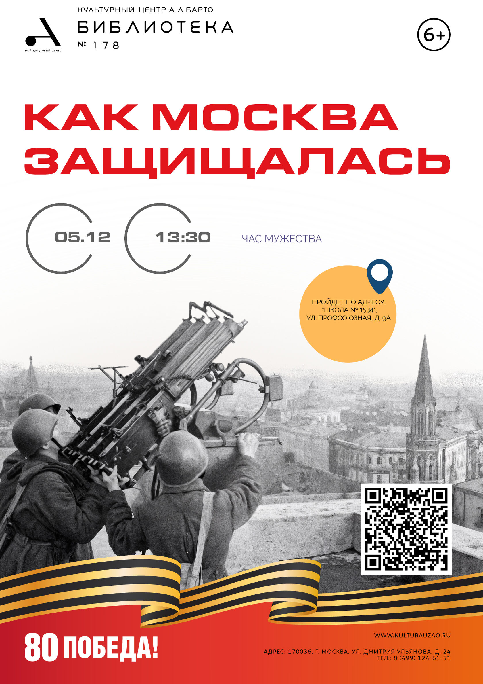 Детская библиотека № 178 – Культурный центр А. Л. Барто приглашает юных москвичей на особенное мероприятие, посвященное одному из самых драматичных периодов в истории нашей столицы – Битве под Москвой. Участники программы перенесутся в суровую осень 1941 года, чтобы узнать, как жил город, стоявший на передовой. Ребята узнают, как умело маскировали московские улицы и здания, чтобы обмануть вражескую авиацию. Какие действовали правила светомаскировки? Как горожане готовились к возможным бомбардировкам? Мы поговорим о том, как была организована противовоздушная оборона и как каждый москвич вносил свой вклад в защиту города. Особое внимание будет уделено судьбам маленьких москвичей, чье детство пришлось на тяжелые военные годы. Как они учились, играли и помогали взрослым? Какие лишения и трудности им пришлось пережить? Сегодняшние школьники услышат рассказ об их героизме и стойкости духа.