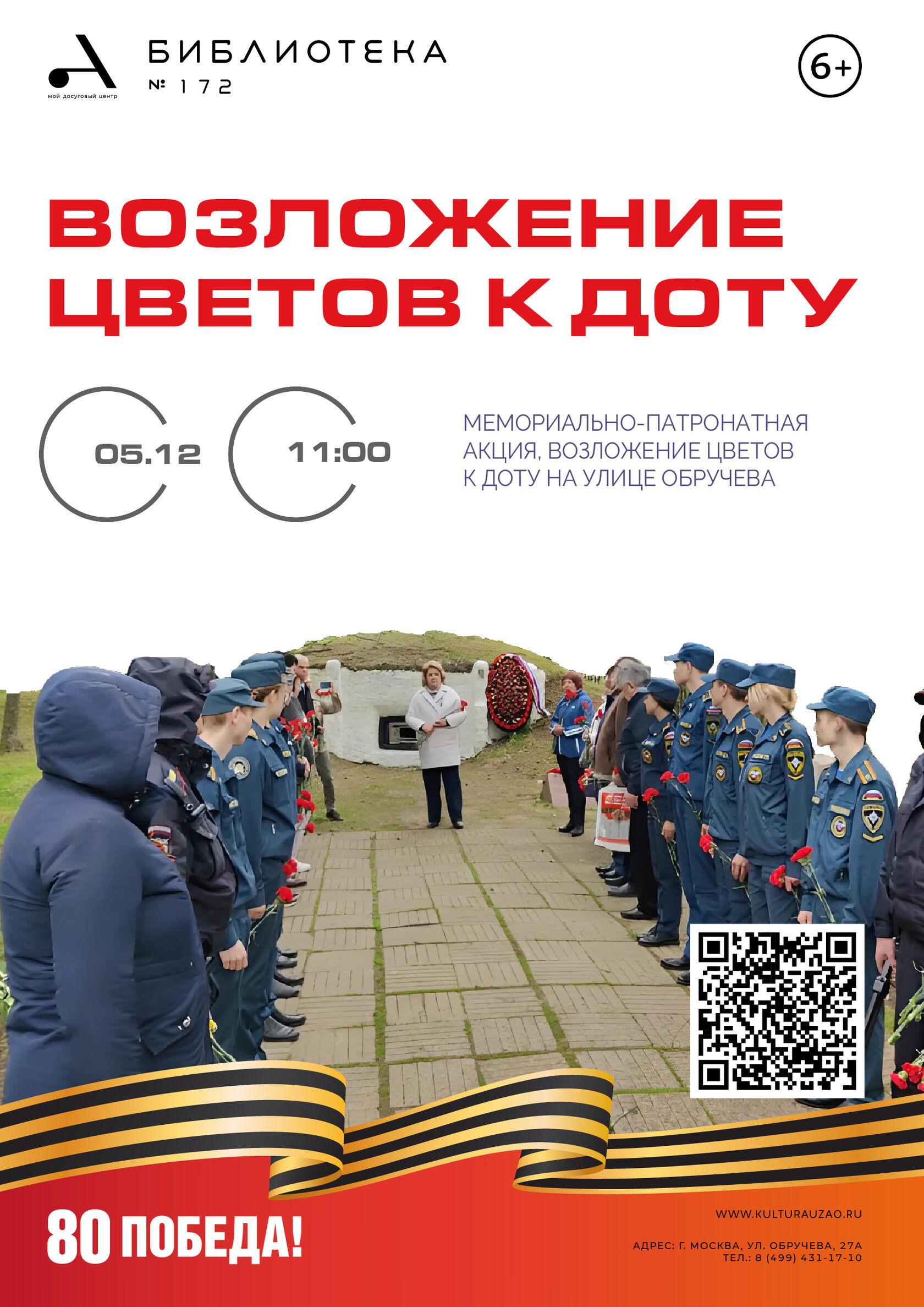 Возложение цветов к ДОТу на улице Обручева в День начала контрнаступления под Москвой — это многолетняя традиция для жителей Обручевского района. В этот день местные жители собираются у памятного объекта, чтобы почтить память тех, кто защищал Родину в годы Великой Отечественной войны. В те времена, когда территория еще не была украшена гранитными памятниками и мемориальными комплексами, жители уже приходили к старой долговременной огневой точке — ДОТу — и возлагали цветы, чтобы помянуть солдат, не вернувшихся с фронта. Этот акт памяти стал символом уважения и благодарности за их героизм и жертвенность. Традиция сохраняется и сегодня, напоминая о важности памяти о прошлом и ценности мира. Каждый год жители собираются у этого памятного места, чтобы вместе почтить память тех, кто отдал свою жизнь за свободу и независимость Родины, и сохранить в сердце благодарность к героям тех суровых лет.