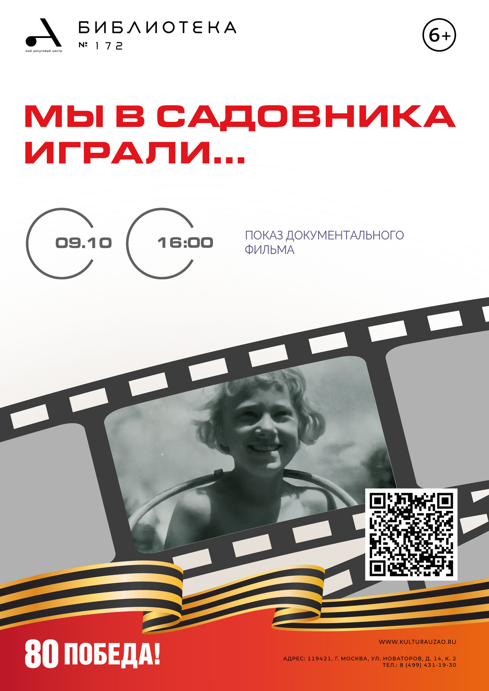 "Библиотека № 172 приглашает на специальный кинопоказ в рамках Международного патриотического фестиваля «Борис Коценко представляет» в честь Дня окончания Второй мировой войны. Вниманию зрителей будет представлен документальный фильм «Мы в садовника играли...». Шестилетней девочкой Валя прошла немыслимый путь из оккупированной Эстонии в осажденную Москву. Одна, без родителей. Как выживали эти дети, как выжили?..Война глазами ребенка, который взрослеет на войне, но сохраняет в себе все детское, чистое и непосредственное. По воспоминаниям Президента общества дружбы «Россия-Норвегия», академика, профессора ВГИК, члена Союза Кинематографистов России Валентины Яковлевны Орловой. После просмотра участников ждет викторина на знание истории, кино и военной литературы с призами для самых эрудированных. К просмотру фильма дети от 12 лет допускаются в сопровождении взрослых, так как документальные кадры содержат тяжелые сцены."