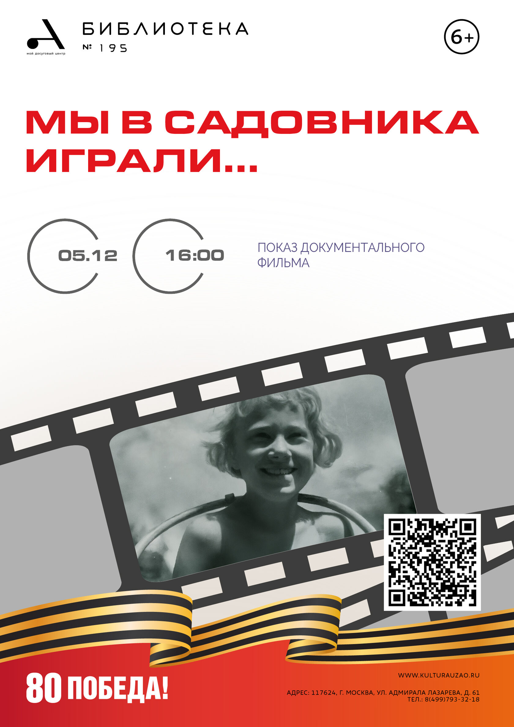 5 декабря 2025 года в 16:00 в Библиотеке № 195 состоится кинопоказ документального фильма "Мы в садовника играли..." в рамках Международного патриотического фестиваля "Борис Коценко представляет". Мероприятие посвящено 80-летию Победы в Великой Отечественной войне и важному знаменательному событию в отечественной истории - Битве за Москву. Принять участие могут все желающие читатели и посетители библиотеки. Цель мероприятия - патриотическое воспитание и сохранение исторической памяти.