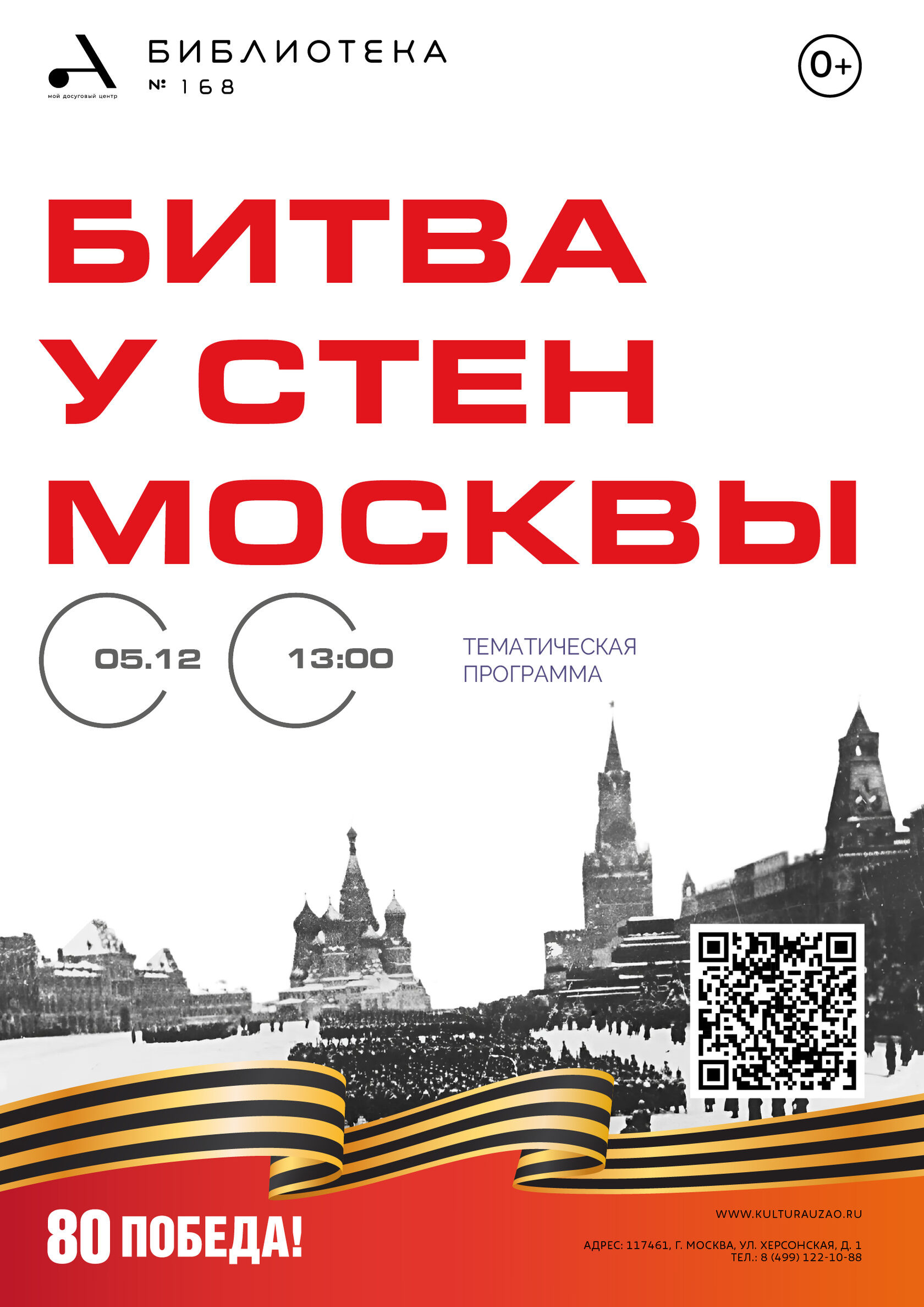 Есть в календаре такие даты, которые навечно вписаны в героическую летопись нашей страны. И одна из них — это день началась контрнаступления советских войск против немецко-фашистских войск в битве под Москвой. 5 декабря 1941 года стало переломным моментом в истории Великой Отечественной войны, нашей страны, всего мира. В этот день советские войска перешли в контрнаступление под Москвой. Победа под Москвой ознаменовала начало коренного поворота в войне. К этой дате в библиотеке № 185 состоится мероприятие, посвященное этой важной странице Великой Отечественной войны. Сотрудники библиотеки расскажут ребятам о ходе и итогах этой битвы, о героических подвигах тех, кто принимал в ней участие. В заключение мероприятия ребята, разделившись на две команды, и сделают макеты, где воспроизведут события тех лет.