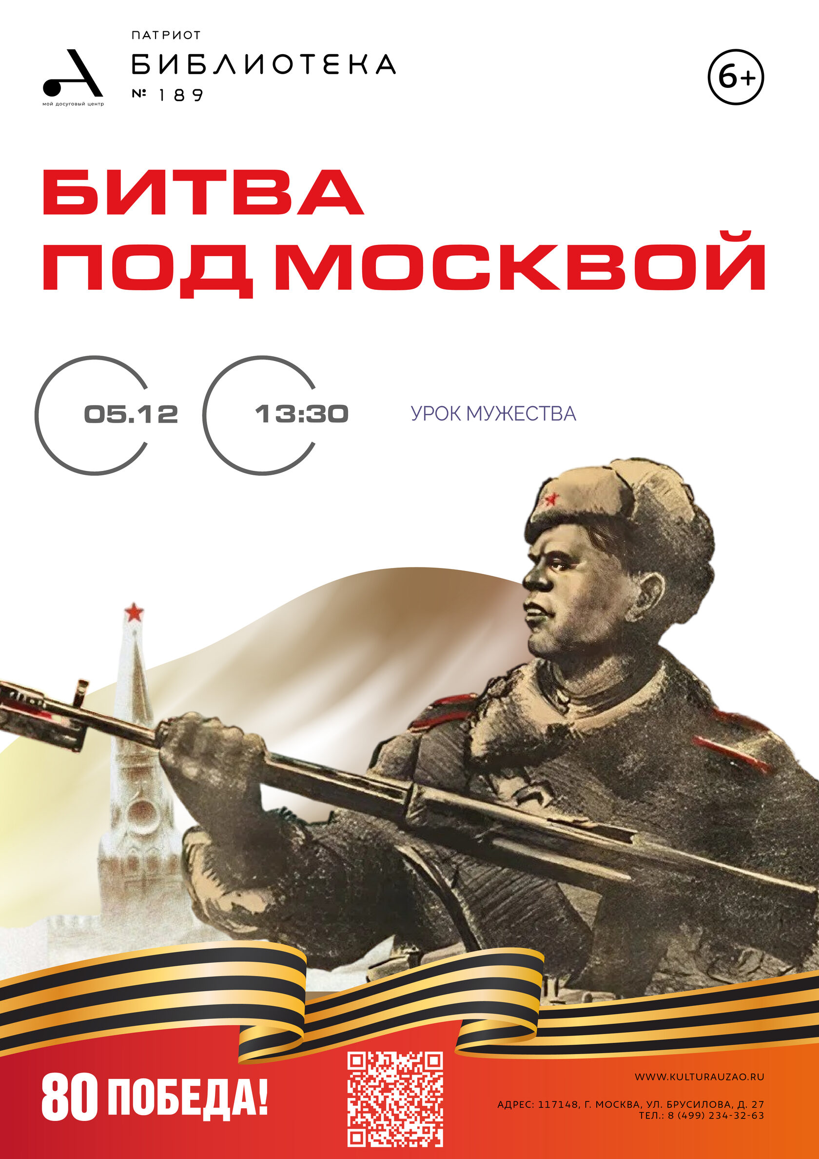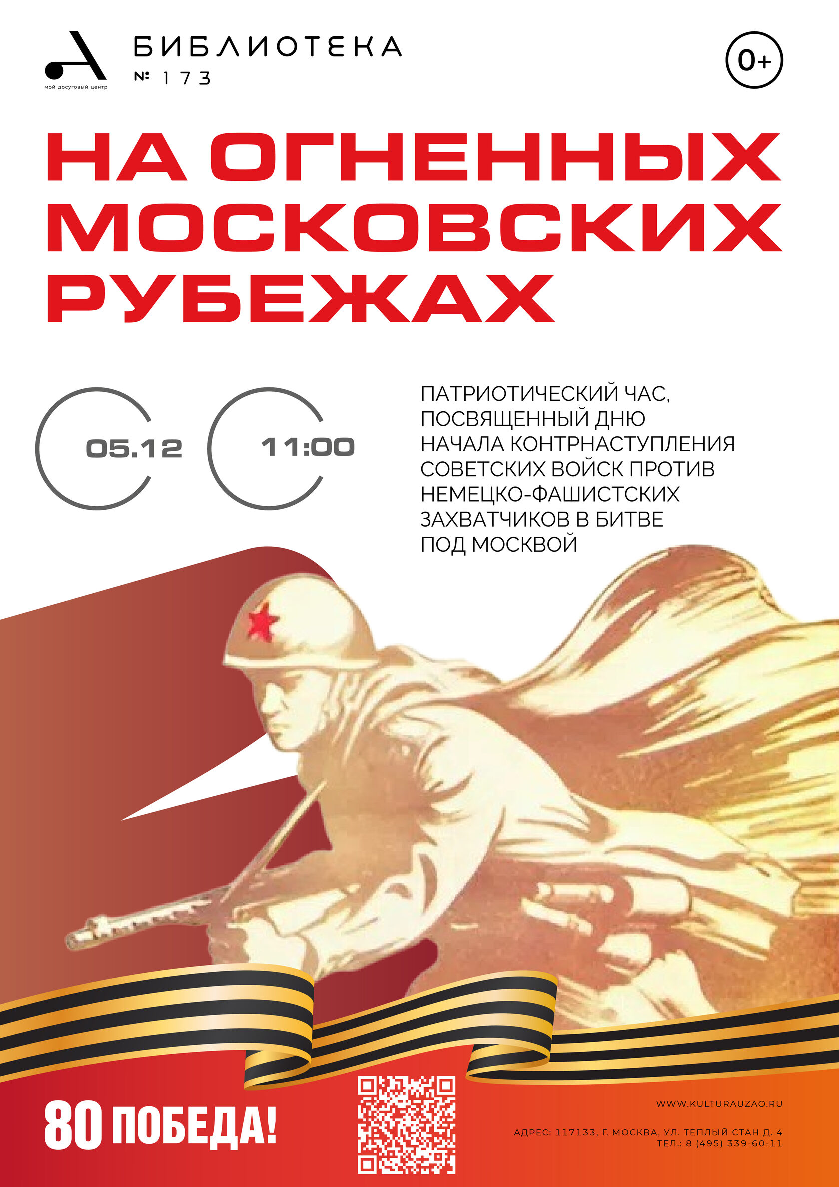 В год 80-летия Победы в Великой Отечественной войне в Библиотеке №173 пройдет комплекс мероприятий, посвященный этой важной дате для всех граждан России и стран бывшего Советского Союза, так как он символизирует окончание одной из самых страшных войн в истории человечества. В этот год Библиотека будет вспоминать подвиг ветеранов и чтить память погибших. 5 декабря в 11:00 Библиотека №173 приглашает своих читателей на патриотический час, посвященный Дню начала контрнаступления советских войск против немецко-фашистских захватчиков в битве под Москвой. На этой интересной и значимой встрече методист библиотеки расскажет детям о героических усилиях бойцов Красной армии, которые смогли остановить наступление немцев под Москвой, сдержав мощный и неожиданный отпор фашистов.