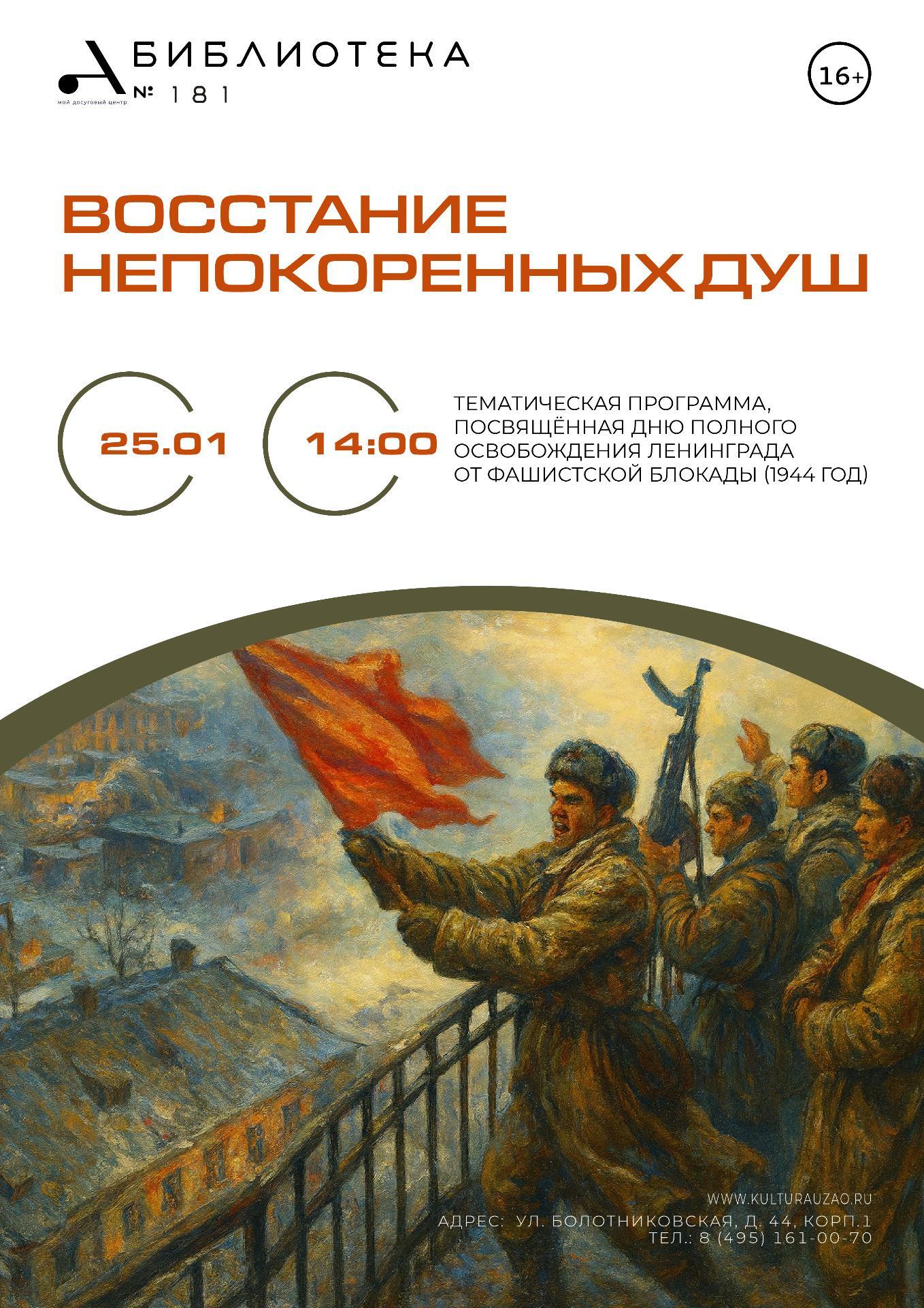 Библиотека № 181 приглашает жителей и гостей города на тематическую программу "Восстановление непокоренных душ", посвященную 82-й годовщине снятия блокады Ленинграда. Откроет встречу литературно-поэтическая композиция "Память, живущая в сердцах": Прозвучат стихи Ольги Берггольц, Анны Ахматовой и других поэтов, переживших блокаду. Музыкальные произведения того времени создадут особую атмосферу. Продолжит встречу показ документального фильма "Блокадный дневник". Фильм основан на реальных событиях и дневниковых записях жителей Ленинграда. 🏡Наш адрес: ул. Болотниковская, д. 44, корп. 1 ☎8 499 121-30-92