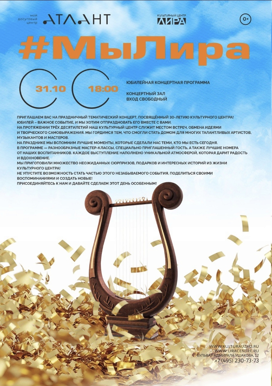 В фойе - выставка художественных работ воспитанников изостудий, творческие мастер-классы и фотозона «Лира 30» с оригинальными инсталляциями. В концертном зале - праздничный концерт, в котором выступят лучшие коллективы центра: вокальные, хореографические и театральные студии. Торжественная часть включает поздравления педагогов и руководителей, ведь именно благодаря им «Лира» уже три десятилетия остаётся сердцем культурной жизни Южного Бутова.