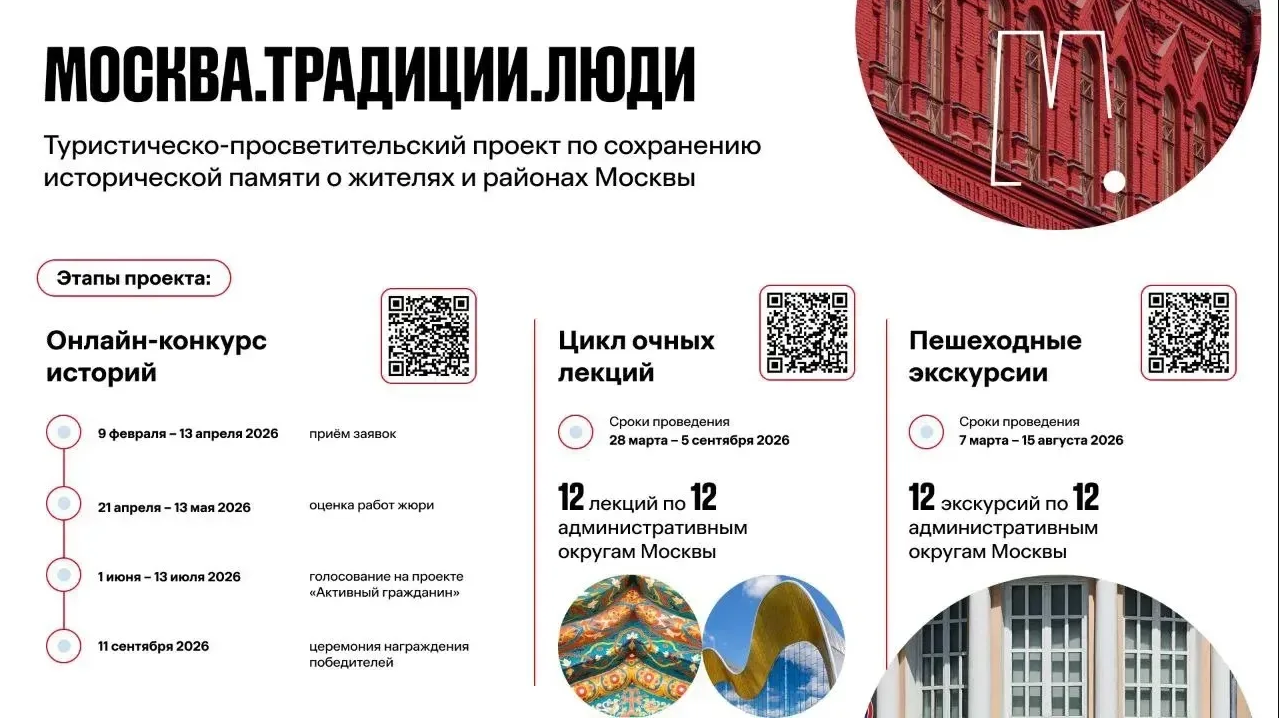 9 февраля 2026 года в рамках туристическо-просветительского проекта "Москва.Традиции.Люди" открылся прием заявок на конкурс уникальных историй о наследии московских районов среди жителей столицы, где участникам предлагается предоставить конкурсную работу о выдающихся людях, династиях, местах и объектах, связанных с историей жизни в Москве!