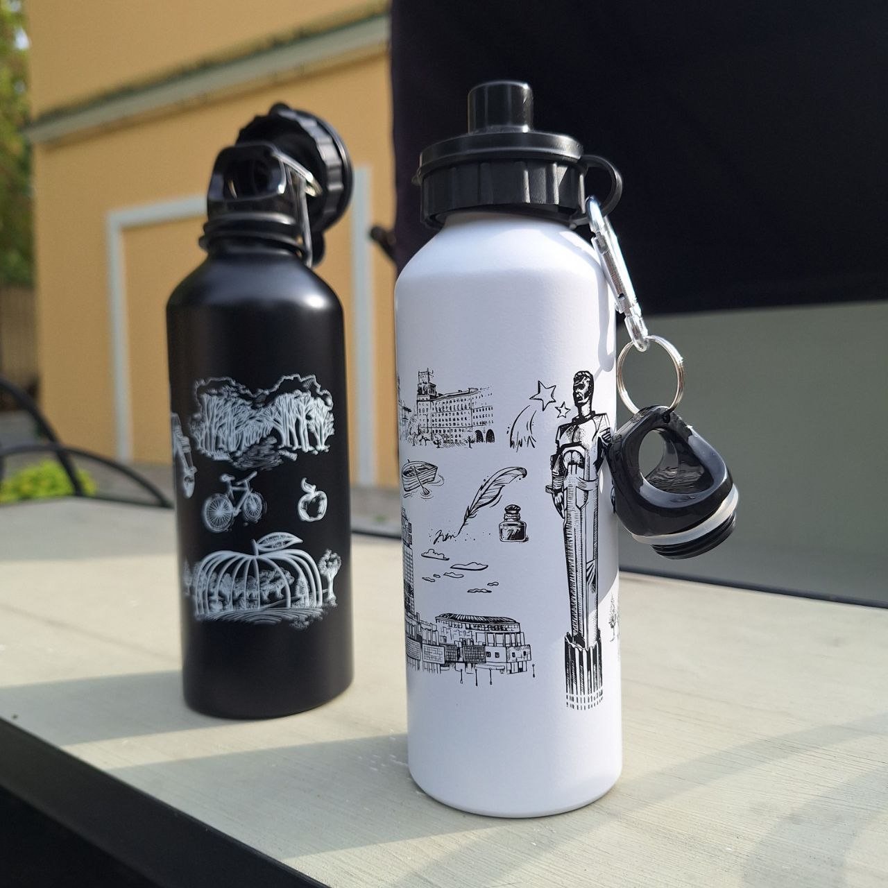 У нас можно забрать домой частичку очарования ЮЗАО. Термокружки, бутылки для воды и стикеры украшены эксклюзивными авторскими рисунками.