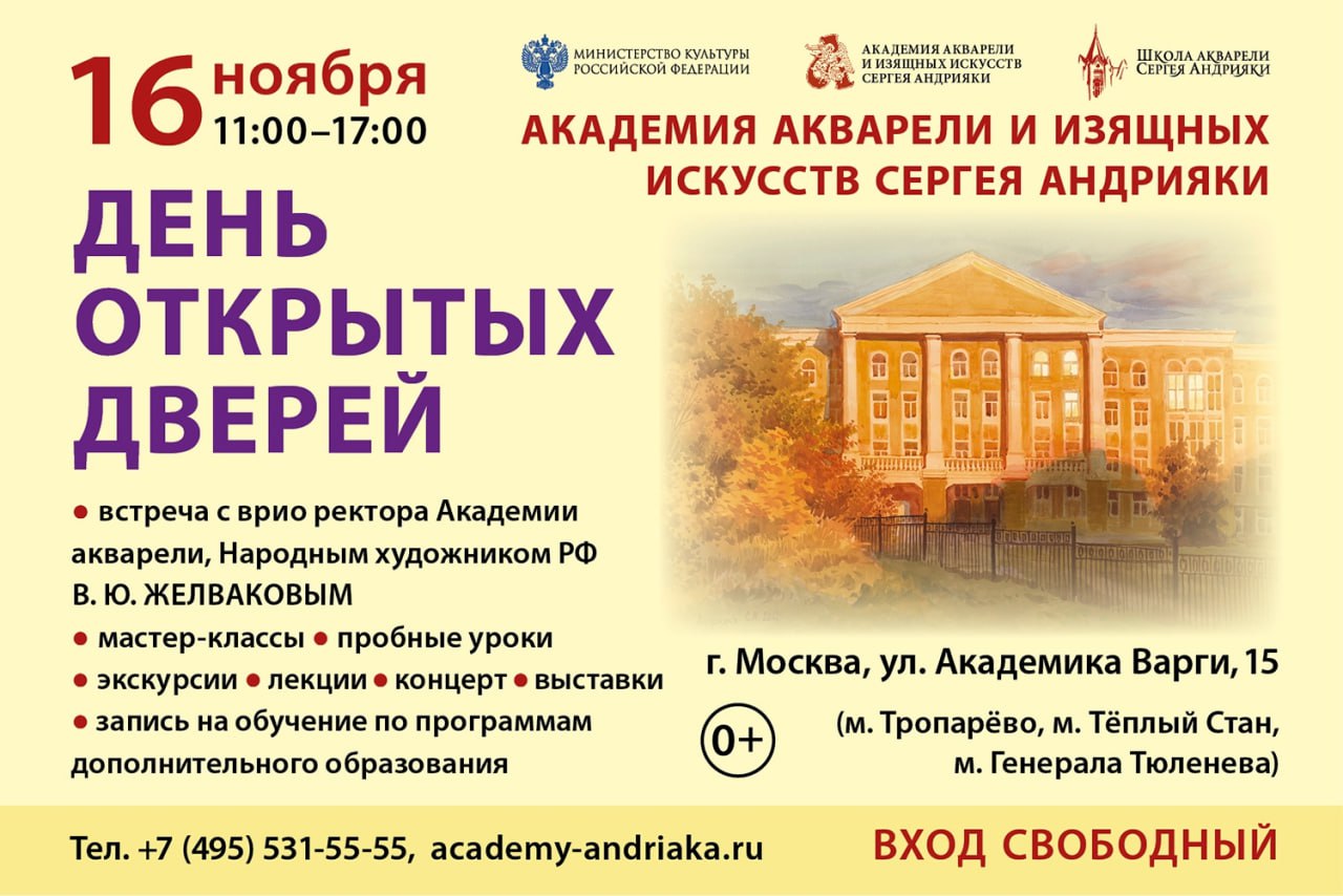Академия акварели и изящных искусств Сергея Андрияки - это высшее художественное учебное заведение нового типа, не имеющее аналогов ни в России, ни за рубежом. Здесь готовят художников, владеющих широким спектром техник: акварель, темпера, масло, мозаика, витраж, скульптура, фарфор, эмаль, иллюстрация и многое другое.